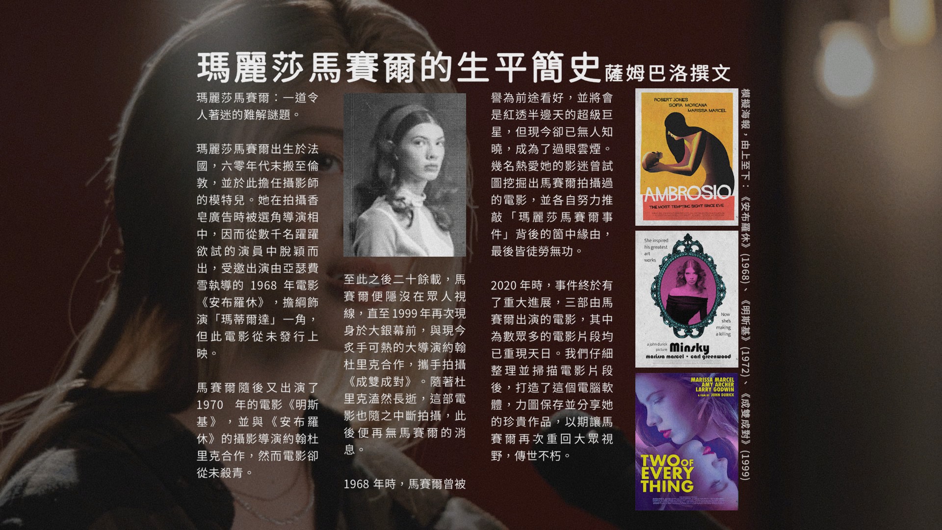 另一个重要的点与《传世不朽》的主题有关,即“时间”。无论是从电影世界还是现实世界的角度来说,本作的叙述重点一直跟随着时代的变化而变动。第一部《安布罗休》看似揭示了虚伪的圣人神父如何陨落的全过程,一边轻松地将其罪责归咎于女人的诱惑,一边大张旗鼓地描绘裸露场面并作为宣传卖点。到了第二部《明斯基》电影主题变得先锋凛冽,第三部《成双成对》又来到经典的好莱坞名利场叙事。然而,无论故事的内核如何流转,本作都紧紧抓住了锚点——女主角玛丽莎·马赛尔。她如同幽灵一般,她的容颜和思想都浮于时间之上。